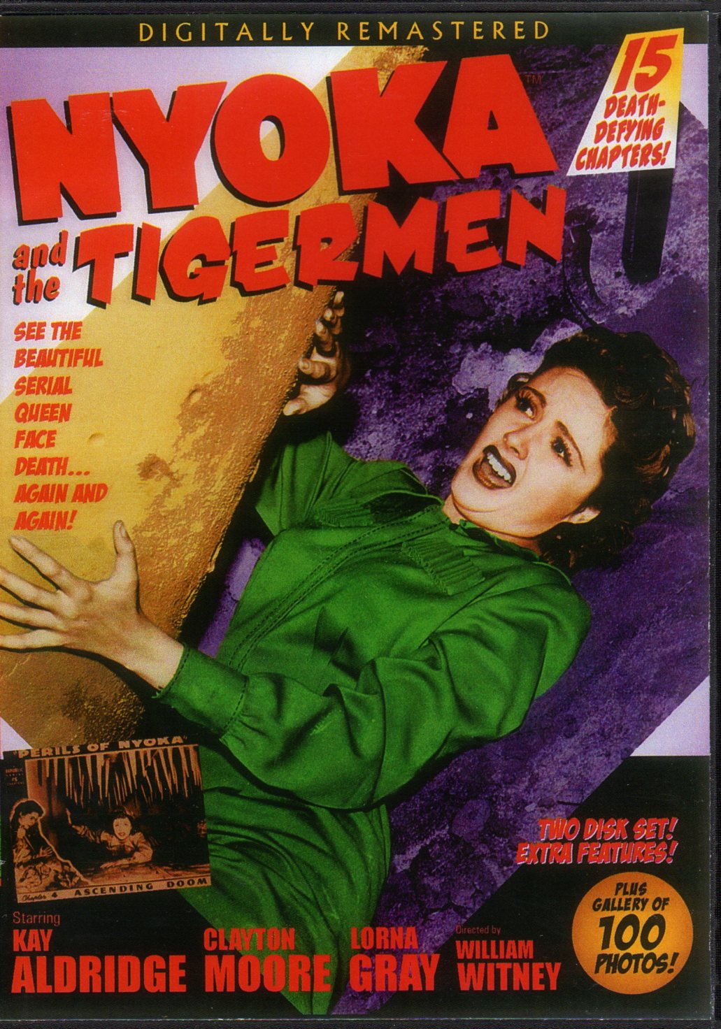 Two-DVDs containing 15 episodes of Nyoka and the Tigermen, a Republic Pictures classic from 1942. The evil beauty, Vultura, attacks an African expedition led by Nyoka, played by gorgeous cover model Kay Aldridge. Clayton Moore (TV’s Lone Ranger) plays the two-fisted hero in his first starring role!