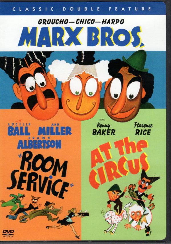The Marx Bros. try to find a backer for a Broadway play then scramble to find a backer for a circus. So we put them backer to backer in this hilarious twofer. In Side A’s Room Service (with Lucille Ball and Ann Miller) a cash-strapped theatrical troupe reasons no one would bounce a sick man from a hotel room. And that leads to a diagnosis of crazy comedy full of feigned illness fake suicides a bogus physician and more Marxist doctorin.’ The 3-ring circus that is Groucho Chico and Harpo provide big-top bedlam At the Circus (Side B). Groucho and Chico work a badge skit Chico and Harpo scour a strongman’s bedroom for evidence Groucho extols Lydia the Tattooed Lady and logic like the orchestra at the film’s conclusion is cut adrift and out to sea. You can learn a lot from Lydia. And laugh a lot with these classic romps.