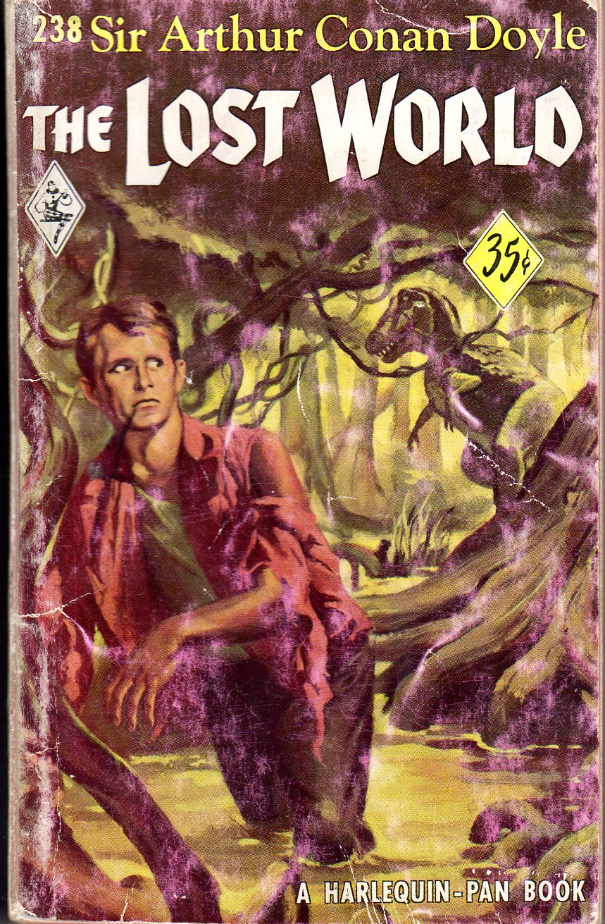 Harlequin book #238; (July/1953); Professor George Edward Challenger on a scientific expedition to explore a hidden plateau in the depths of the Amazon. The plateau is a scientific dream: it appears frozen in a time when dinosaurs still roamed the earth. But as the expedition team plunges deeper into the forest, the danger mounts: they become embroiled in a war between a tribe of Indians and brutal ape-men, and are surrounded by terrifying Prehistoric Creatures. Now it is up to Ed and the Professor to get out alive; Classic Fantasy story by the creator of Sherlock Holmes.